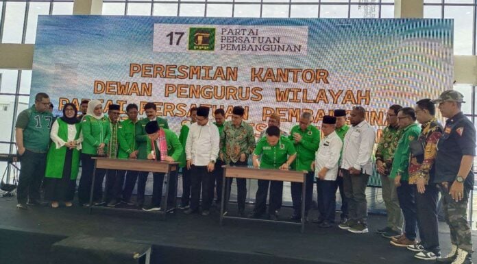 Ketua Umum Partai Persatuan Pembangunan (PPP) Muhammad Mardiono dan Ketua DPW PPP Sulsel, Imam Fauzan AU meresmikan Kantor DPW PPP Sulsel, Jalan Sungai Saddang Kota Makassar, Jumat 24 November 2023..