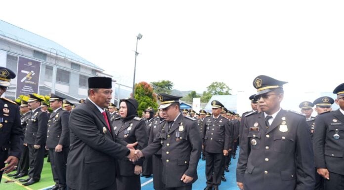 Penjabat Gubernur Sulawesi Selatan (Sulsel), Bahtiar Baharuddin, bertindak sebagai Inspektur Upacara (Irup) pada Hari Bhakti Imigrasi Ke-74 Tingkat Provinsi Sulsel, di Lembaga Pemasyarakatan Kelas II A Palopo, Jalan Dr Ratulangi, Buntu Datu, Kecamatan Bara, Kota Palopo, Jumat, 26 Januari 2024..