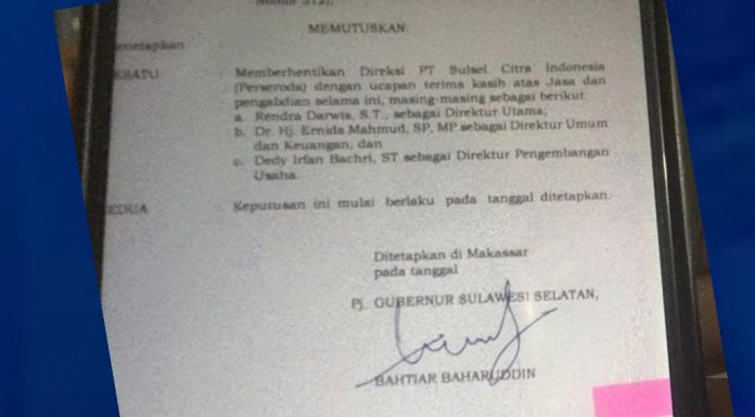 Direktur Utama PT Sulsel Citra Indonesia (SCI) Perseroda Sulawesi Selatan (Sulsel), Rendra Darwis dikabarkan diberhentikan dari jabatan..