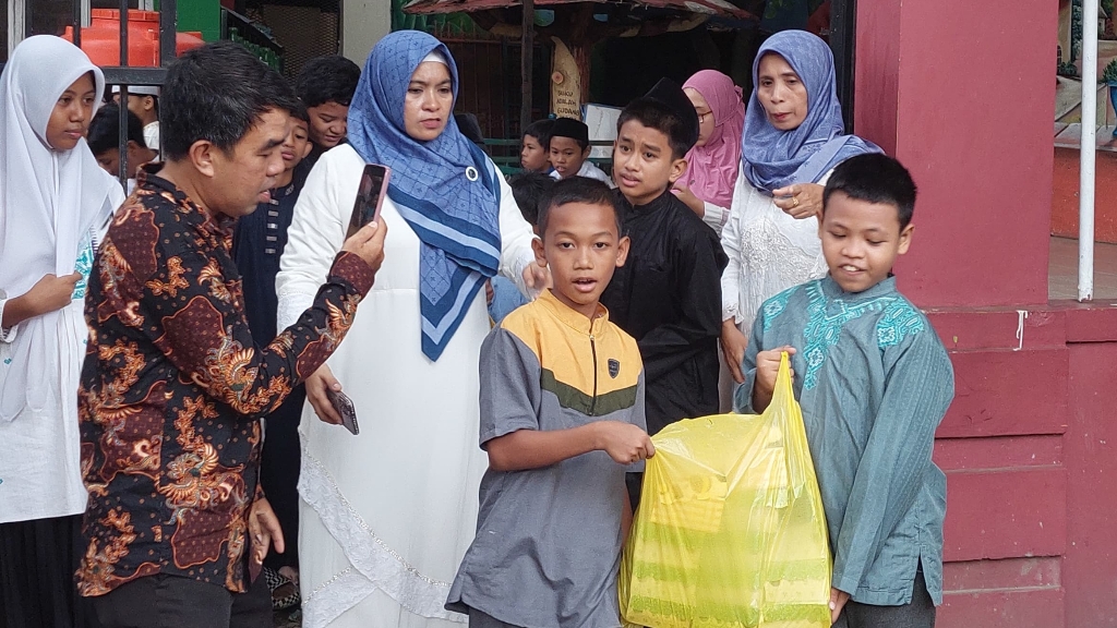 Siswa UPT SPF SD Negeri Pongtiku 2 melakukan pembagian takjil di depan sekolah kepada masyarakat sekitar, Sabtu, 23 Maret 2024.